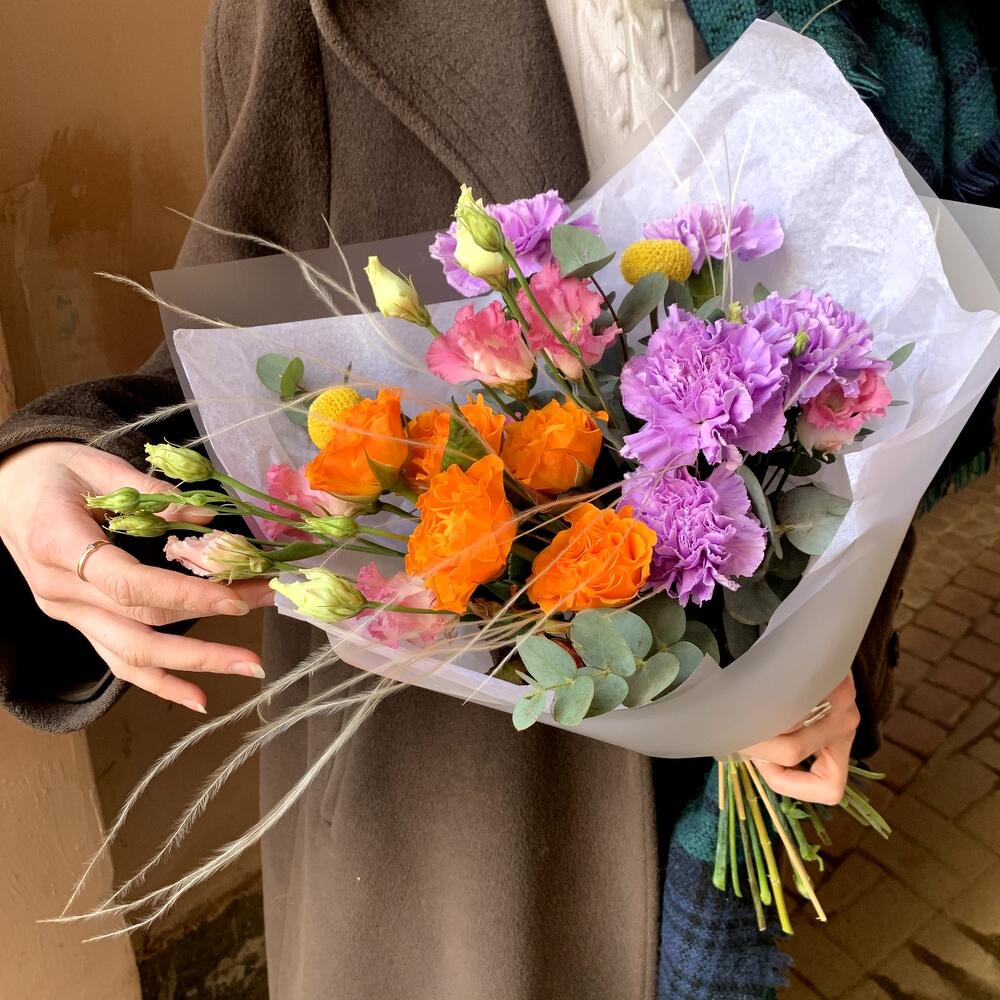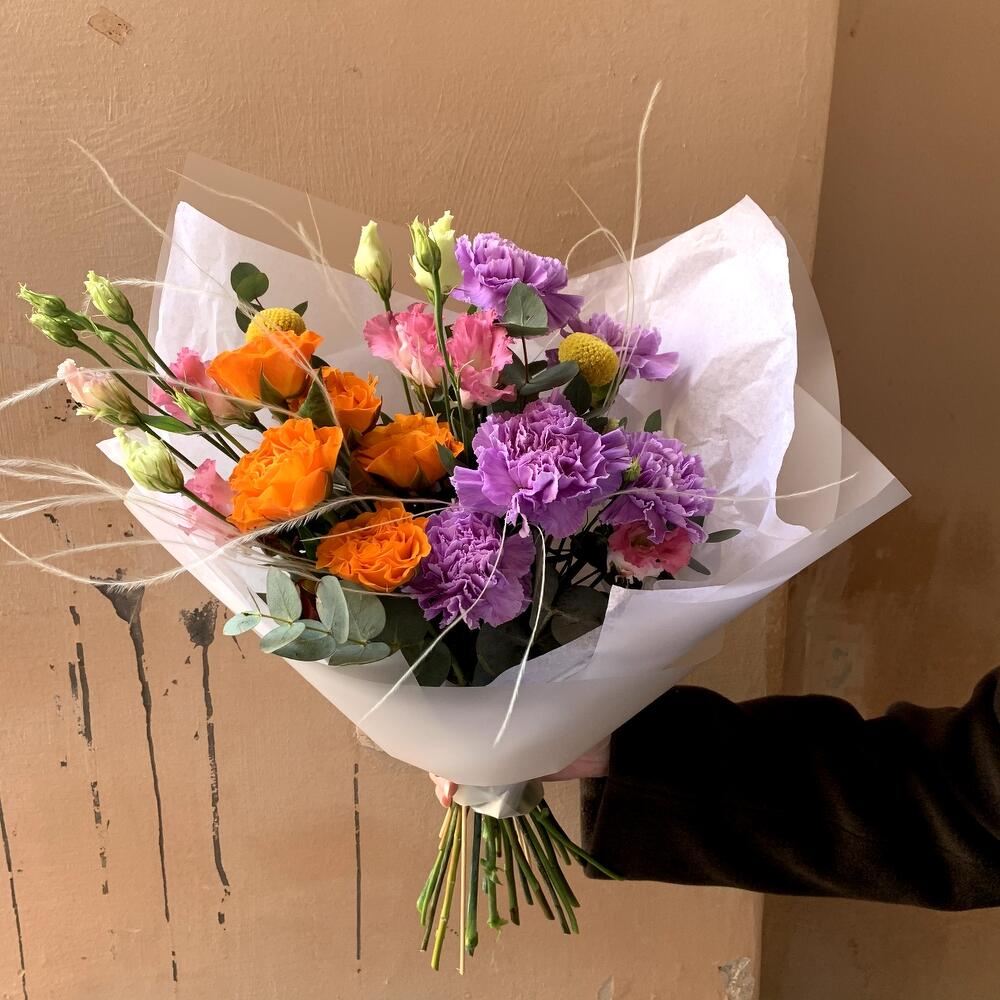 Краспедия – 2 шт.Эвкалипт – 1 шт.Гвоздика лунная – 5 шт.Лизиантус розовый – 1 шт.Стифа – 1 шт.Авторская упаковка – 1 шт.роза россия оранжевая – 5 шт.