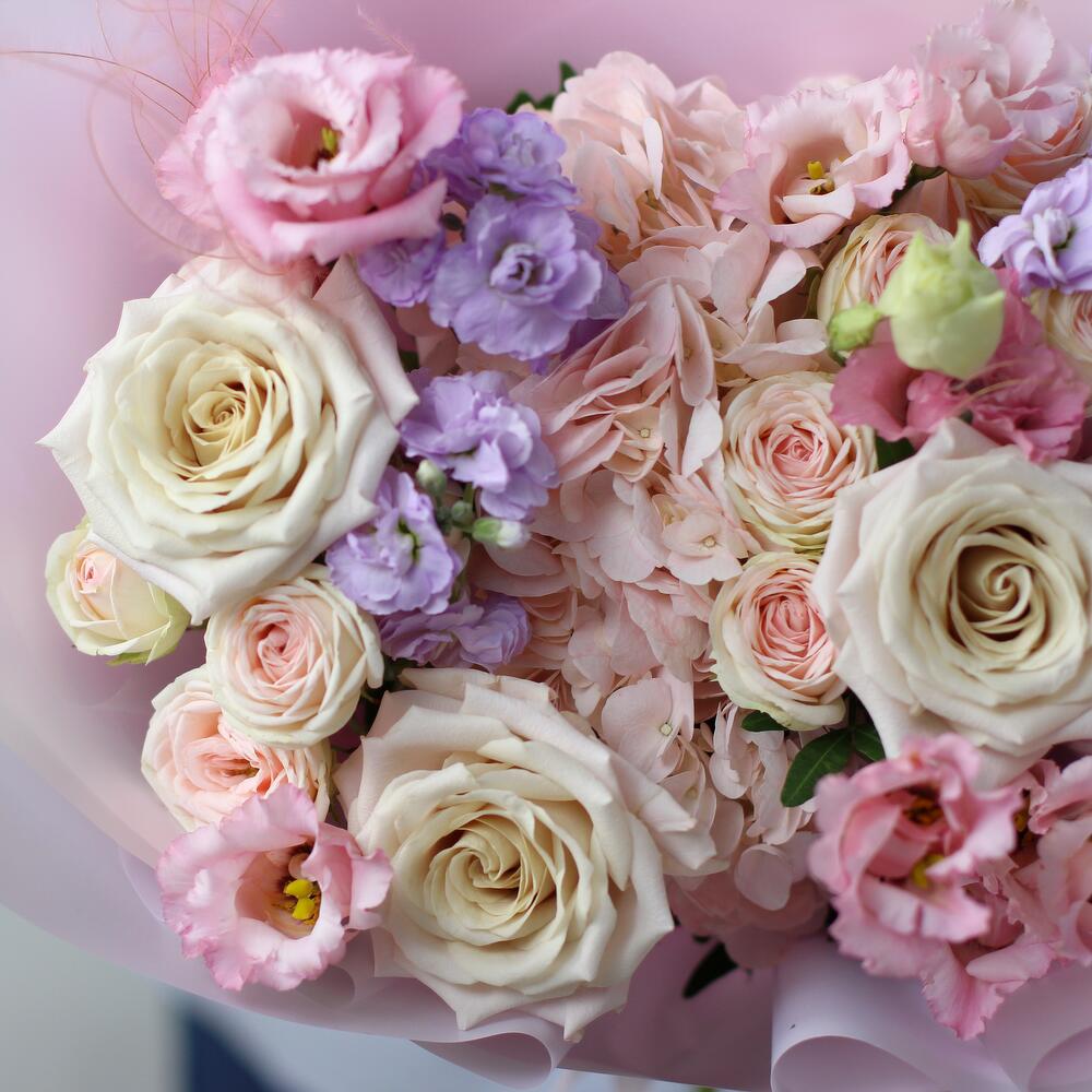 Гортензия – 1 шт.Маттиола – 3 шт.Писташ – 4 шт.Лента атласная – 1 шт.Роза кустовая пионовидная – 2 шт.Упаковка дизайнерская – 4 шт.эустома розовая – 3 шт.Стифа – 2 шт.Роза мента 50 см – 3 шт.пика пальма – 1 шт.