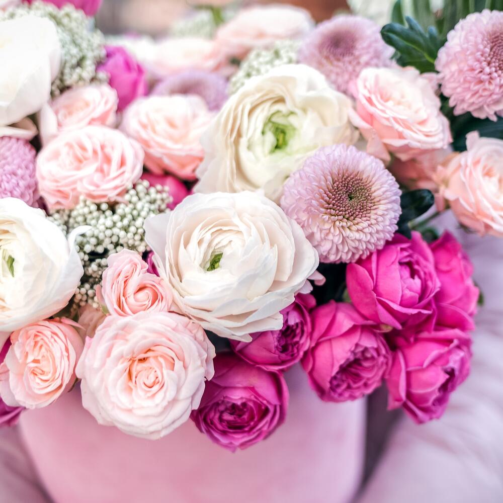 Маттиола – 10 шт.Кустовая роза – 5 шт.Хризантема – 5 шт.монстера лист – 4 шт.ранункулюсы – 10 шт.пионовидные розы кустовые – 10 шт.