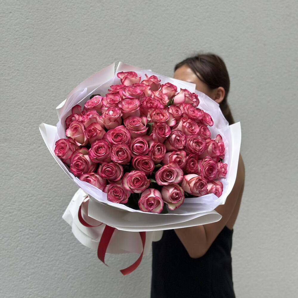 Моно-букет из изысканных роз в оттенках малинового рассвета.