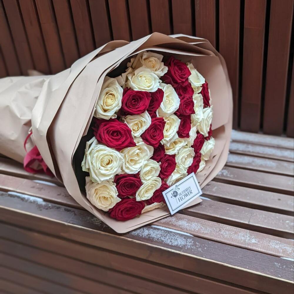 Букет из 41 красной и белой розы в стильной упаковке “Красно-белое боке”