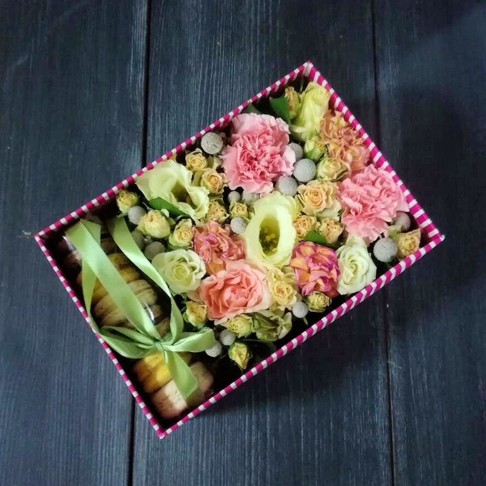 Коробка – 1 шт.Гвоздика розовая – 5 шт.Роза кустовая кремовая – 5 шт.эустома белая – 3 шт.Бруния сильвер – 2 шт.Макарон – 6 шт.Оазис флористический – 1 шт.