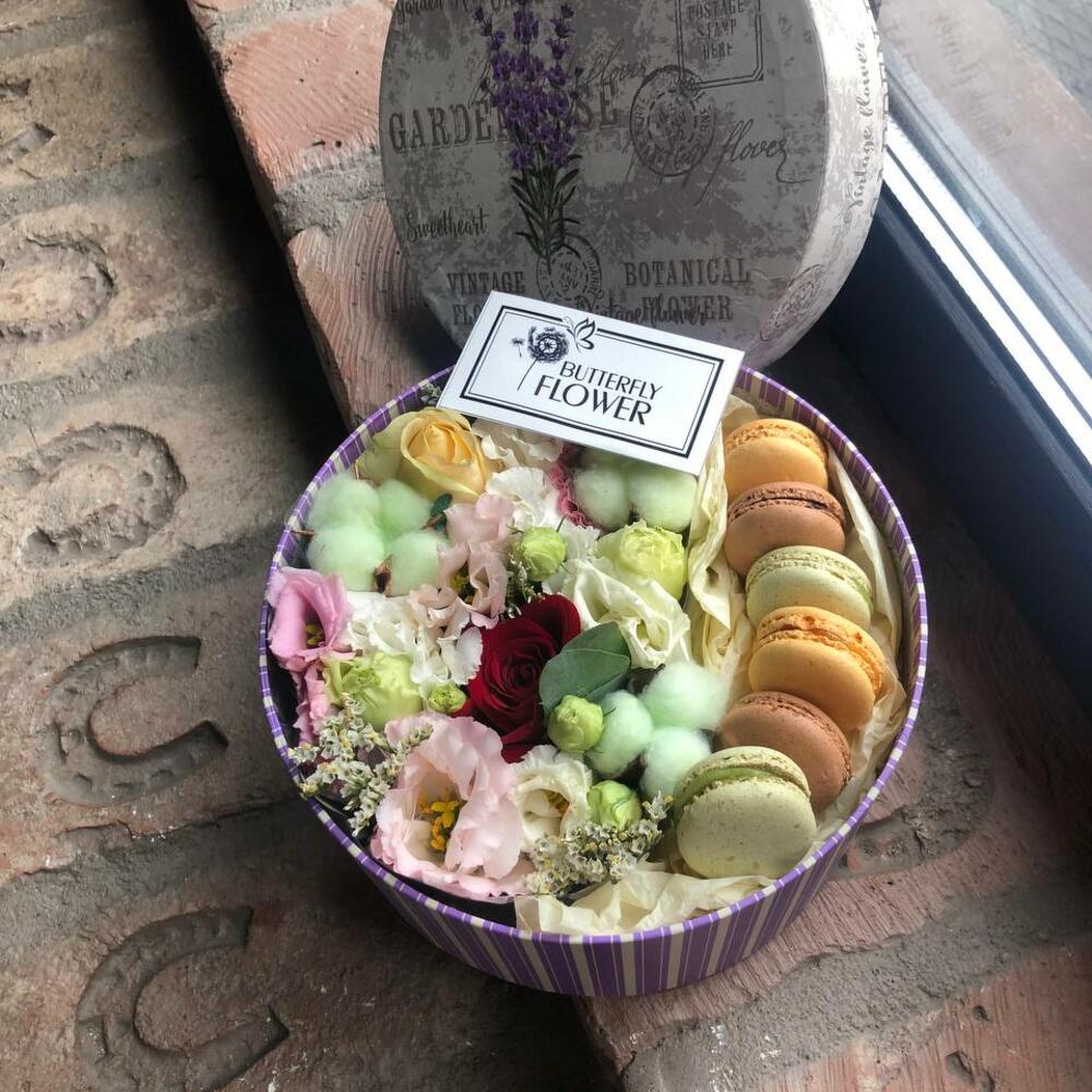 Роза кустовая – 4 шт.Хлопок – 3 шт.Эустома – 1 шт.Шляпная коробка – 1 шт.Макарон – 6 шт.декоративная зелень – 2 шт.
