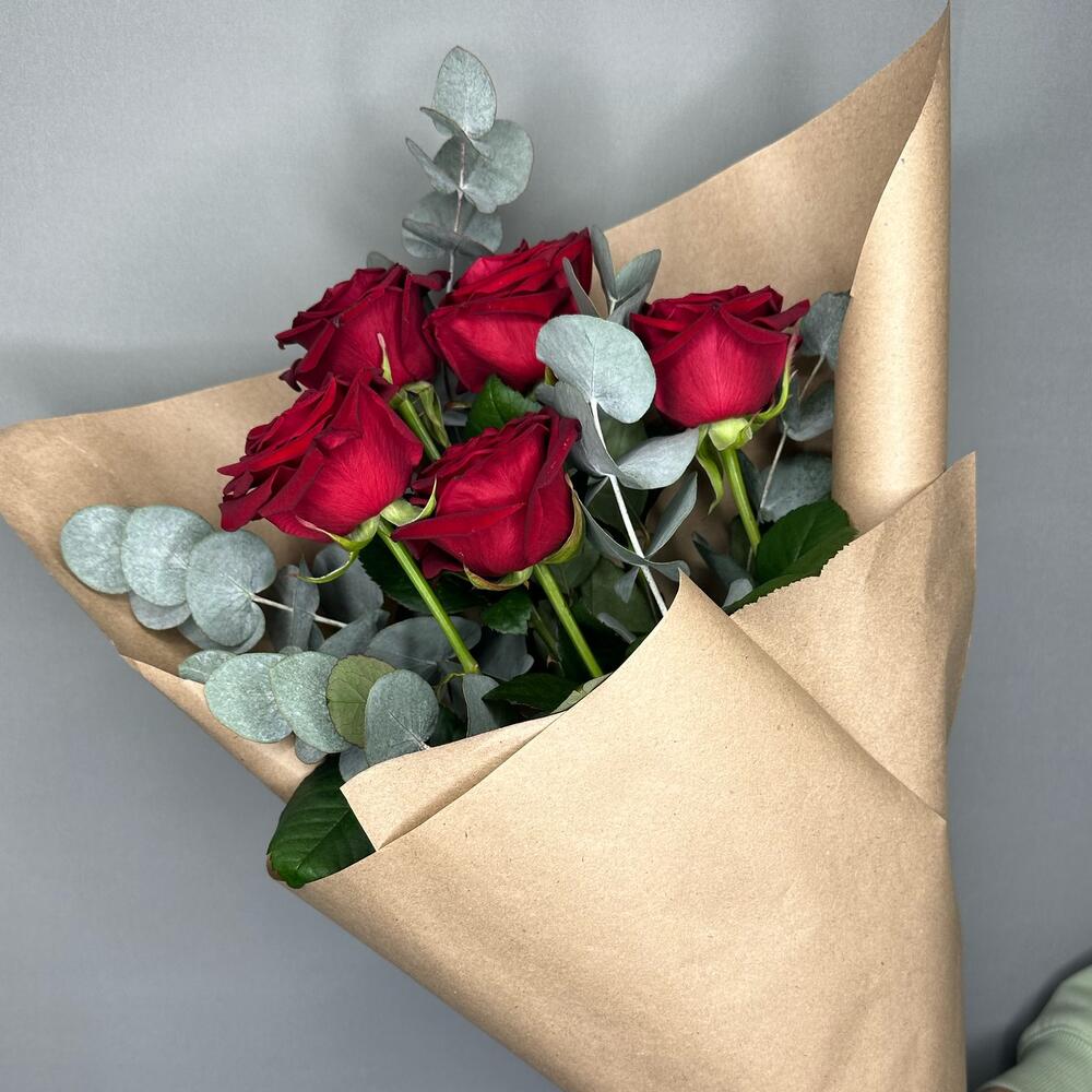 Лента атласная – 1 шт.Упаковка дизайнерская – 1 шт.Роза одноголовая россия – 5 шт.