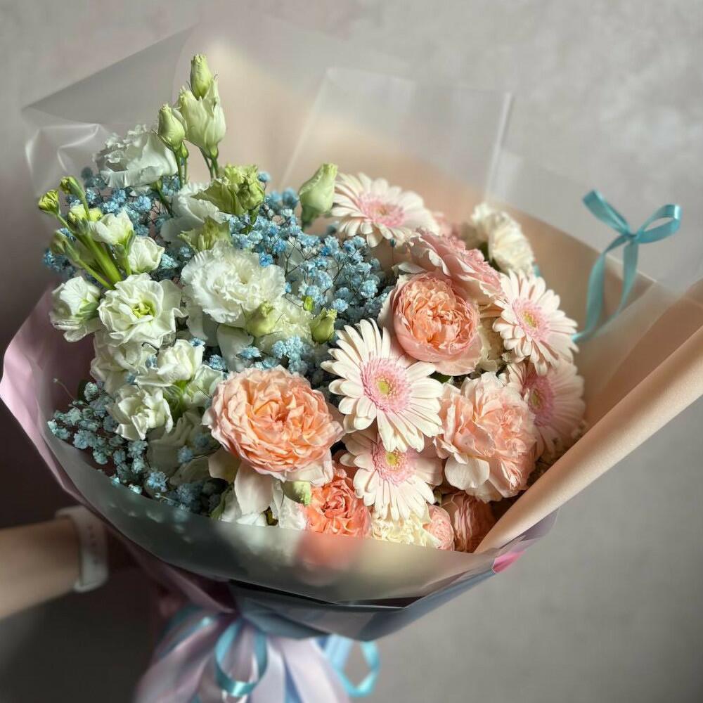 Маттиола белая – 2 шт.Гипсофила голубая – 2 шт.Лизиантус белый – 3 шт.Гербера розовая – 5 шт.пионовидная кустовая роза джульетта – 2 шт.гипсофила белая – 1 шт.Кустовая роза bombastic – 1 шт.Диантус белый – 3 шт.Дизайнерская упаковка – 3 шт.Атласная лента – 2 шт.открытка с правилами ухода за свежими цветами – 1 шт.подкормка для цветов – 1 шт.Транспортировочная коробка – 1 шт.