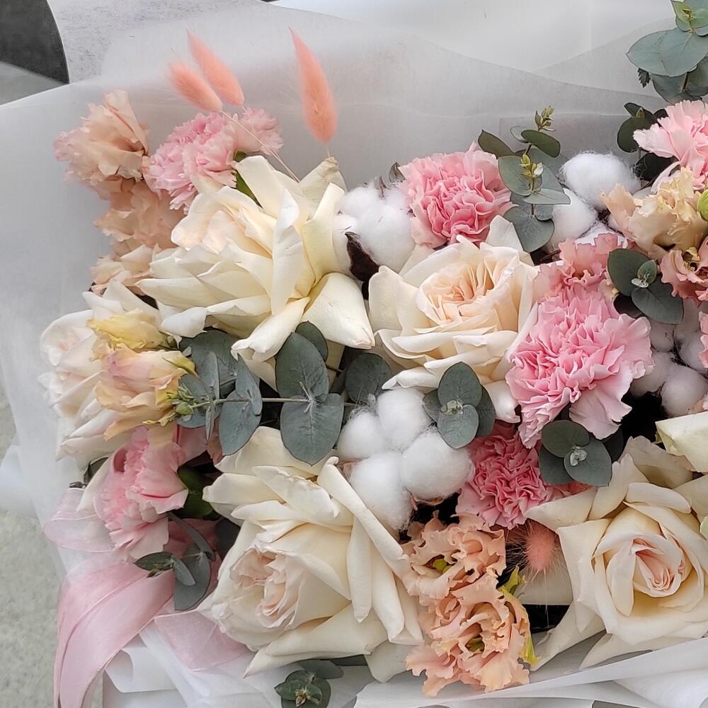 Роза пионовидная – 7 шт.Гвоздика – 7 шт.Хлопок – 5 шт.Лизиантус – 3 шт.Папоротник – 2 шт.Эвкалипт – 2 шт.Лагурус – 7 шт.Упаковка дизайнерская – 2 шт.Лента атласная – 2 шт.