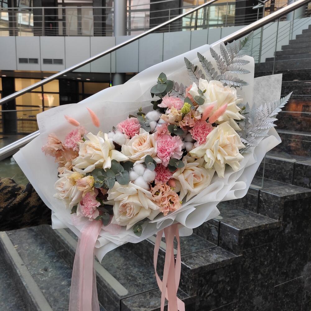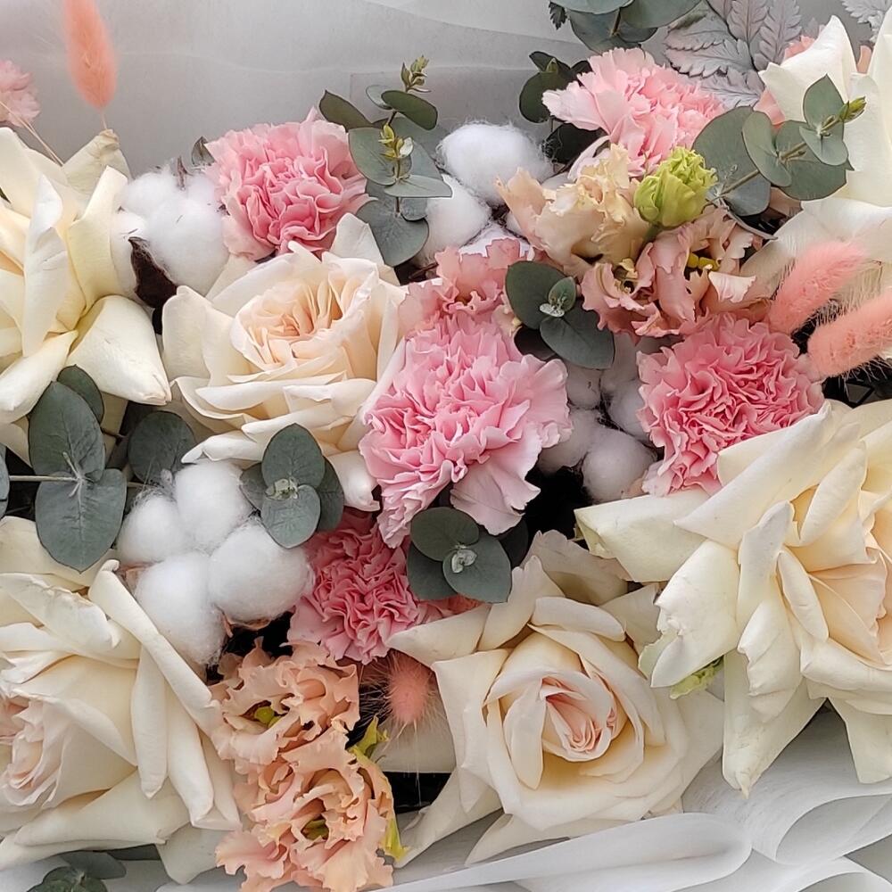 Категорий: Гвоздики, Лизиантусы, Пионовидные розы, Розы, Сухоцвет