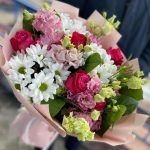 Роза – 5 шт. Эустома – 5 шт. Хризантема кустовая – 3 шт. Салал – 5 шт. Упаковка дизайнерская – 1 шт.