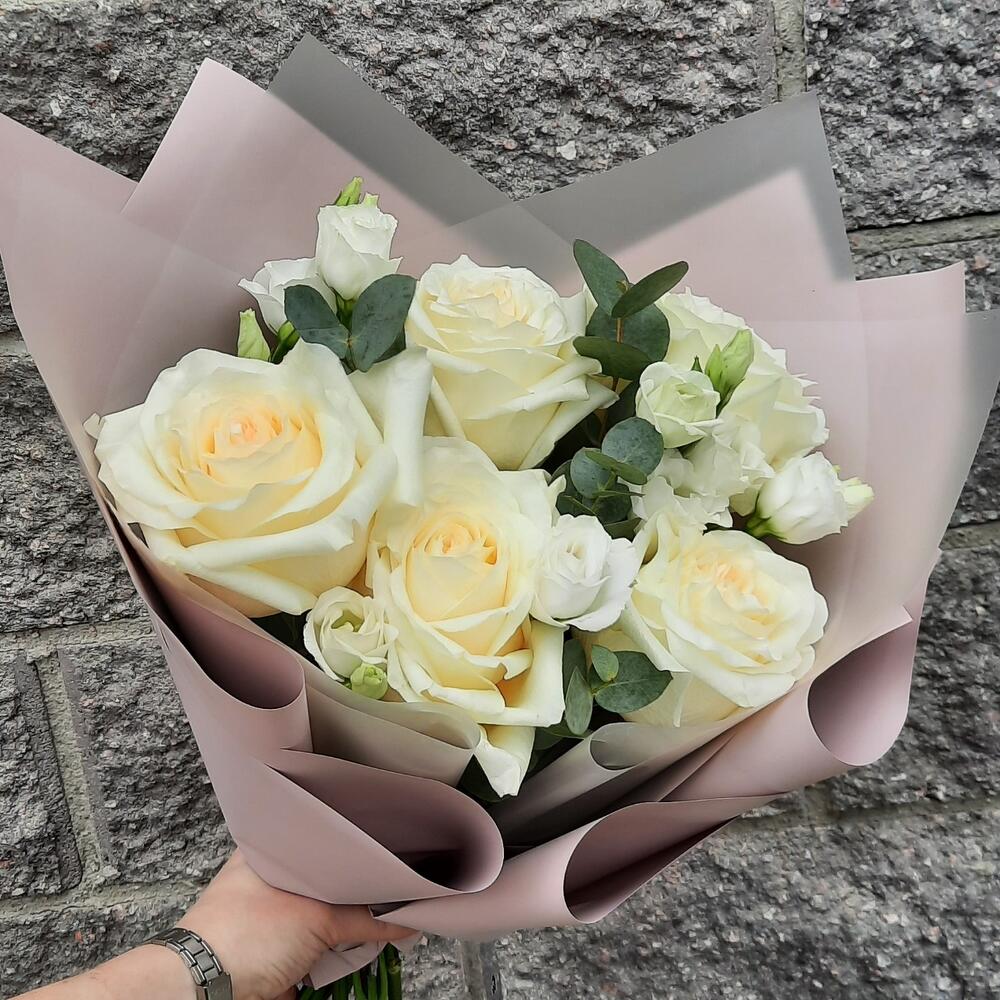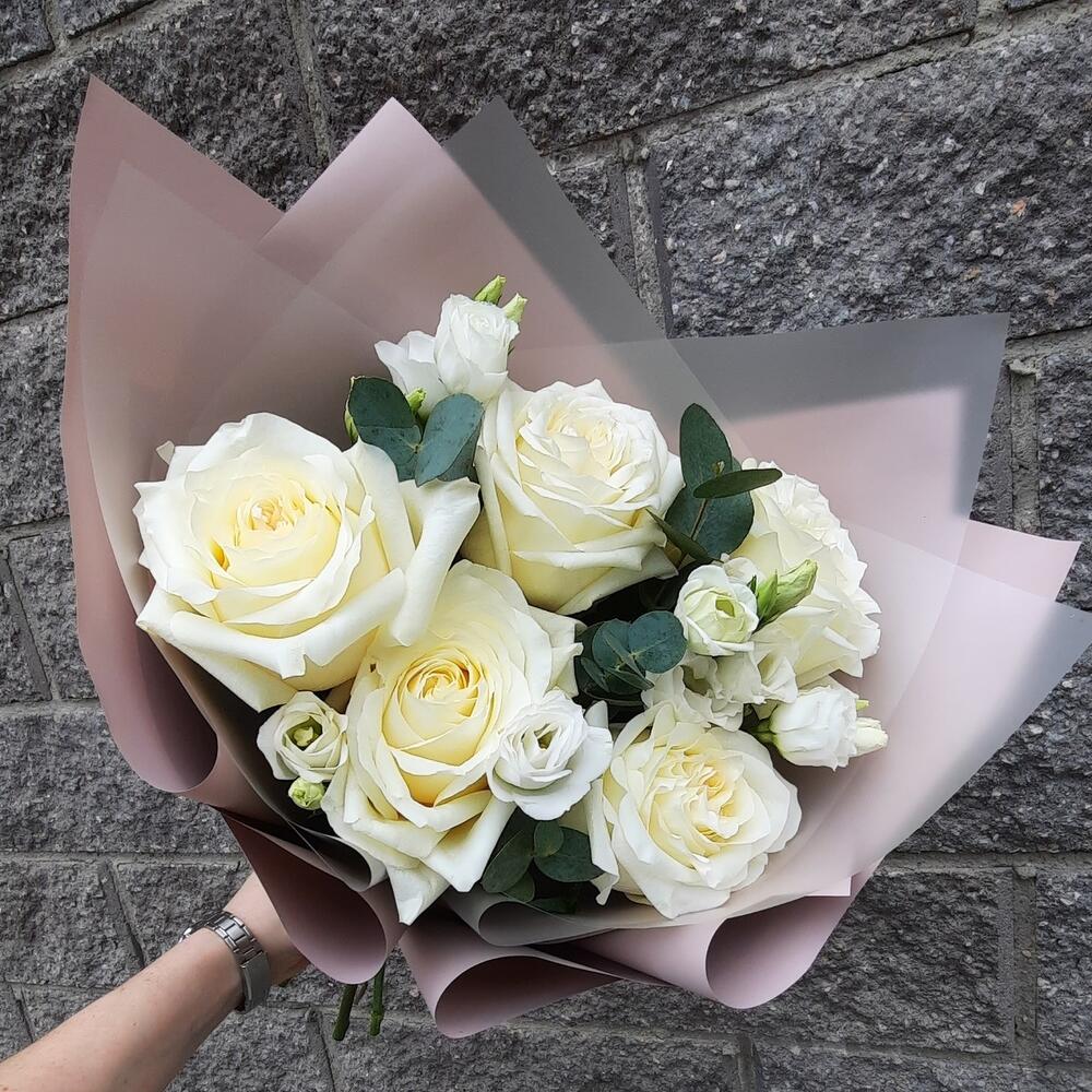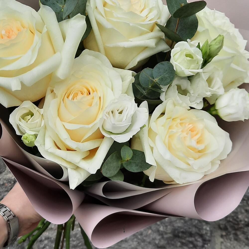 роза кендилайт – 5 шт.эустома белая – 2 шт.Эвкалипт – 1 шт.Упаковка – 1 шт.