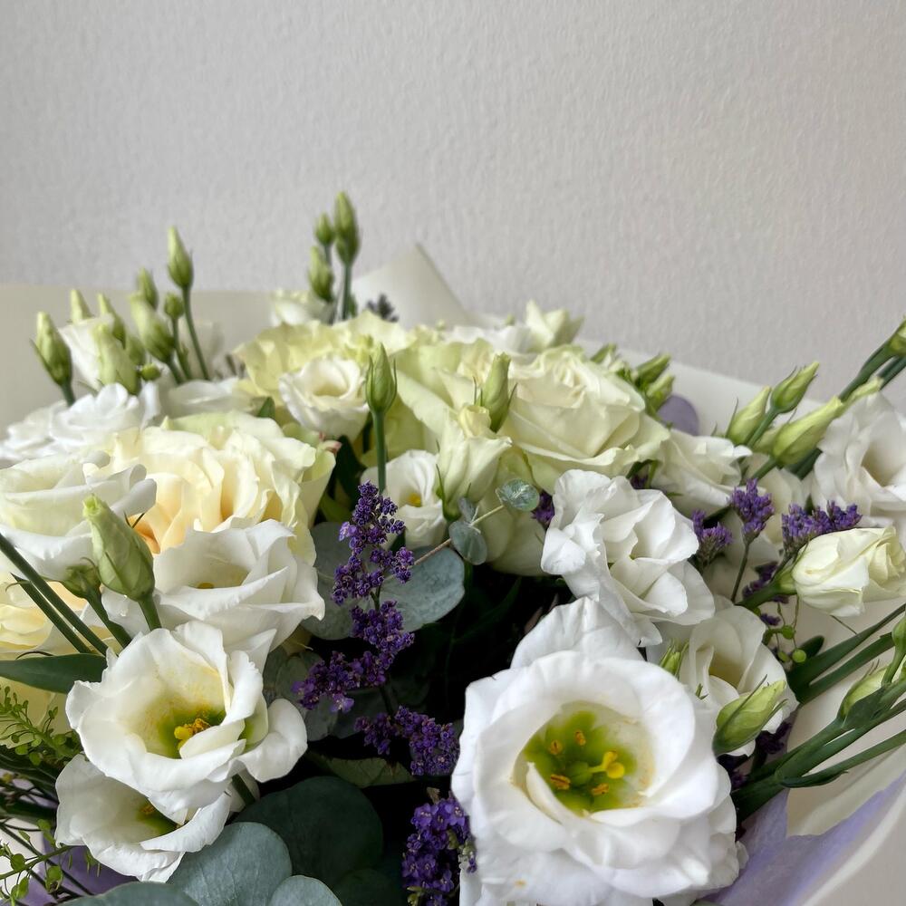Лизиантус – 5 шт.Роза – 3 шт.Лимониум – 3 шт.Эвкалипт – 1 шт.