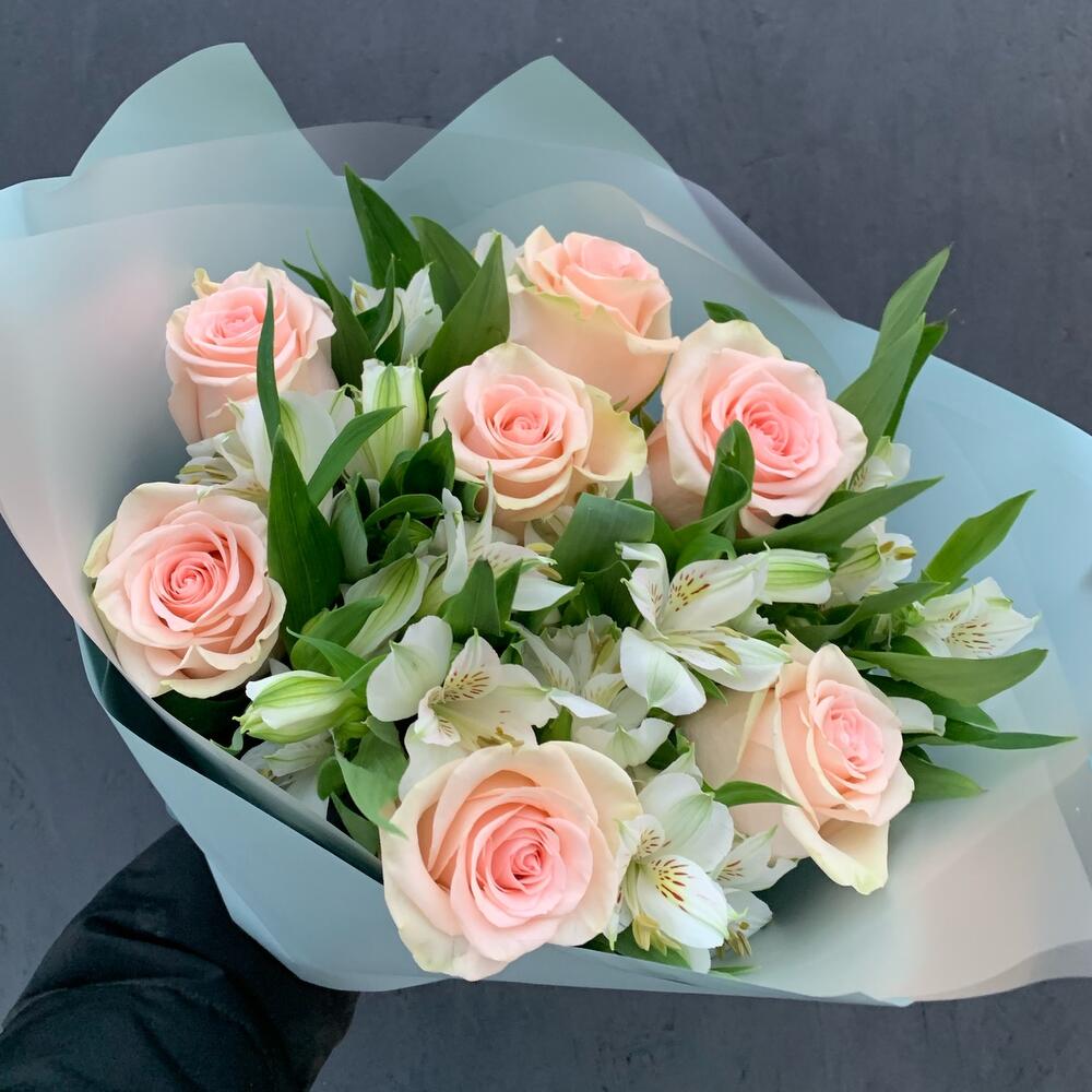 Роза – 7 шт.Альстромерия – 8 шт.Упаковка дизайнерская – 1 шт.