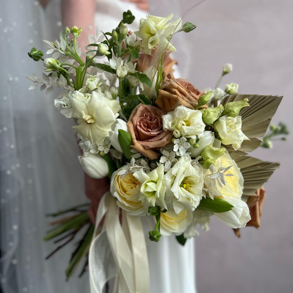 Лизиантус – 2 шт.Маттиола – 3 шт.Тюльпан – 5 шт.Пионовидная роза – 7 шт.Атласная лента – 2 шт.Оксипеталум – 5 шт.рускус сухоцвет – 2 шт.пальмовое копье – 2 шт.японский ранункулюс – 3 шт.