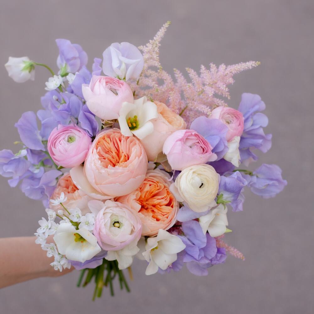 Латирус – 10 шт.Роза Джульетта – 5 шт.Астильба – 3 шт.Ранункулюс розовый – 6 шт.сумка переноска – 1 шт.Ваза – 1 шт.Лизиантус – 1 шт.