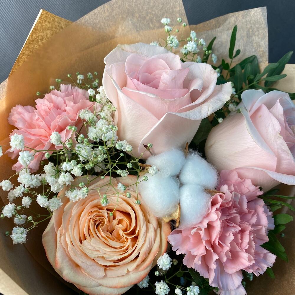 Роза Эквадор – 3 шт.Диантус – 2 шт.Хлопок – 1 шт.Гипсофила – 2 шт.Зелень – 3 шт.Упаковка дизайнерская – 3 шт.Лента атласная – 1 шт.