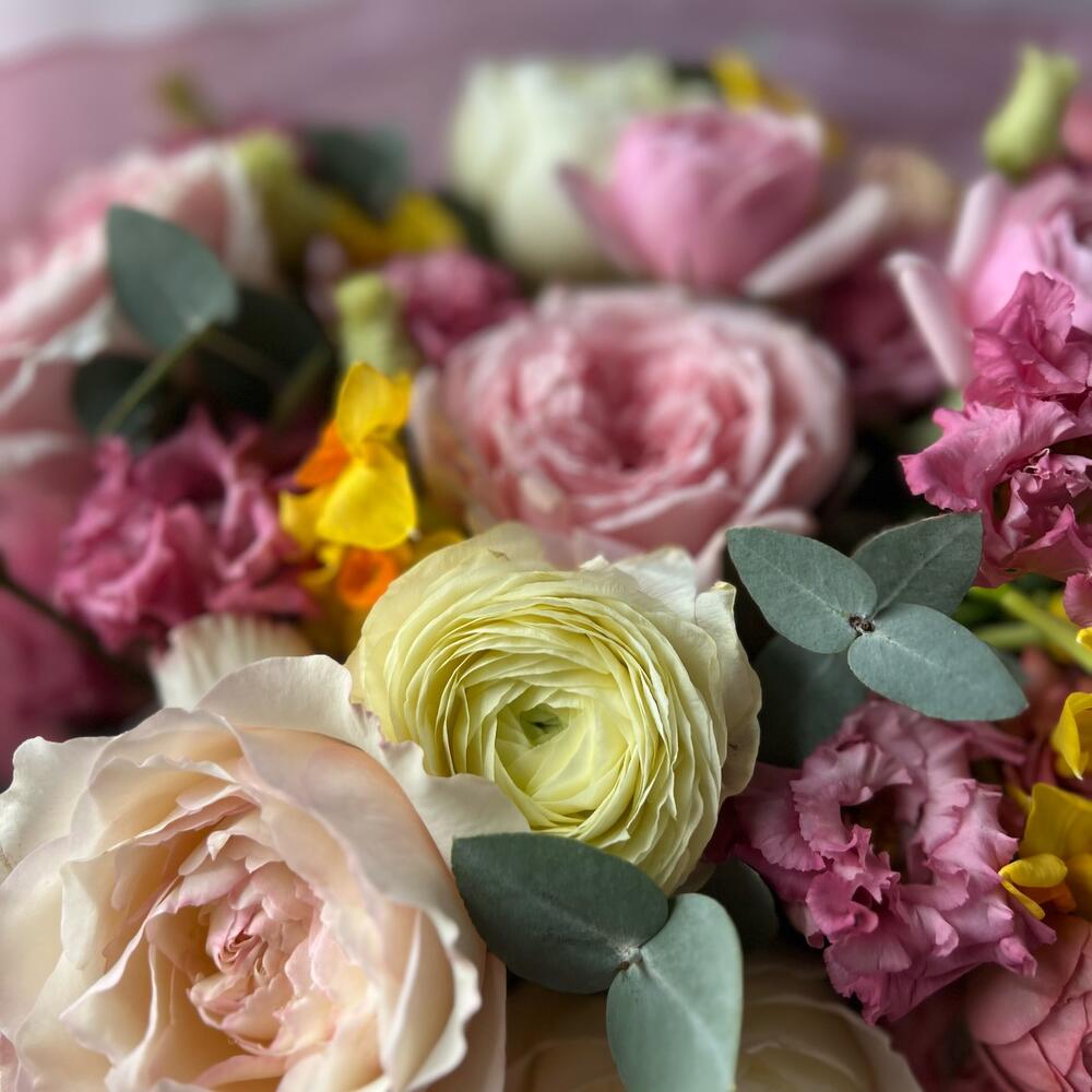 Роза пионовидная – 5 шт.Роза кустовая пионовидная – 4 шт.Эвкалипт – 2 шт.Ранункулюс – 2 шт.Лизиантус – 2 шт.Упаковка дизайнерская – 1 шт.Лента атласная – 1 шт.