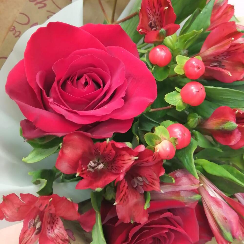 Альстромерия – 3 шт.Гиперикум – 3 шт.Лента – 1 шт.Рускус – 2 шт.Роза – 3 шт.Упаковка – 1 шт.