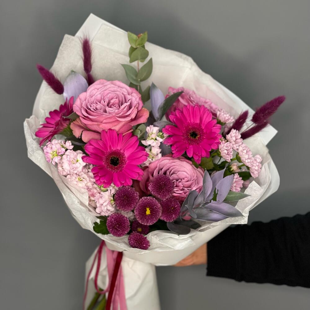 Маттиола – 3 шт.Рускус – 3 шт.Хризантема Сантини – 2 шт.Эвкалипт – 1 шт.Роза одноголовая – 3 шт.Лента атласная – 1 шт.Гербера мини – 3 шт.Упаковка дизайнерская – 1 шт.Лагурус – 7 шт.