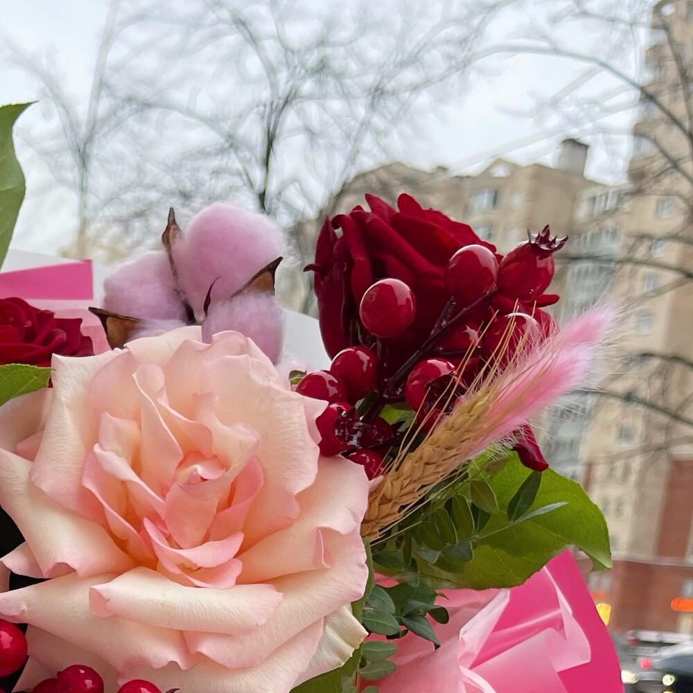 Роза красная – 2 шт.Хлопок – 2 шт.Лента атласная – 4 шт.Тишью – 4 шт.Французская роза – 1 шт.Ягоды декоративные – 3 шт.Пленка матовая – 6 шт.Фисташка пучок – 1 шт.Салал пучок – 1 шт.колосок полевой – 1 шт.