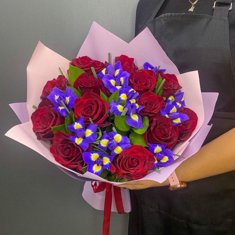 Ирис – 12 шт.Лента – 1 шт.Роза – 13 шт.Зелень – 10 шт.Упаковка – 1 шт.