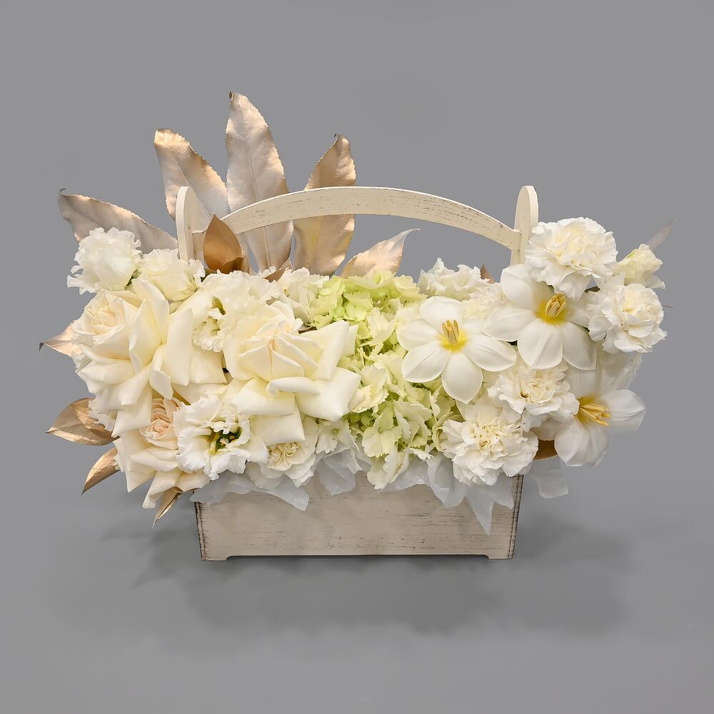 Французская роза – 3 шт.Эустома – 4 шт.Гвоздика – 7 шт.Тюльпан – 3 шт.Гортензия – 1 шт.Рускус – 5 шт.Аралия – 1 шт.Тишью – 2 шт.Ящик деревянный – 1 шт.
