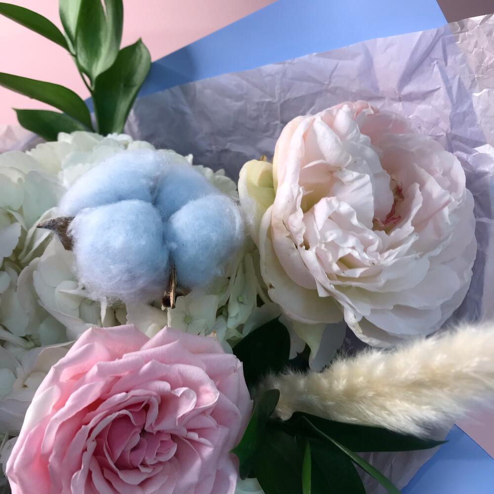 Гортензия – 1 шт.Рускус – 7 шт.Салал – 7 шт.Тишью – 4 шт.Ранункулюс – 1 шт.Роза садовая – 3 шт.Оформление – 1 шт.хлопок сухоцвет – 2 шт.ковыль сухоцвет – 1 шт.Диантус мун аква – 2 шт.Пион Италия – 1 шт.