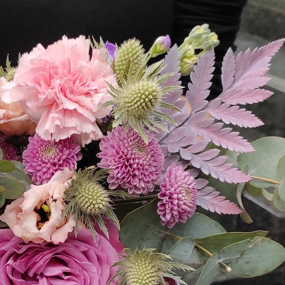 Роза пионовидная – 1 шт.Диантус – 2 шт.Хризантема кустовая – 3 шт.Лизиантус – 1 шт.Эвкалипт – 1 шт.Эрингиум – 1 шт.Папоротник – 2 шт.Лента – 2 шт.коробка кашпо – 1 шт.