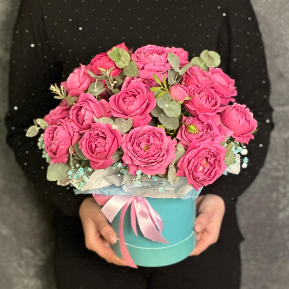 Композиция из ароматных малиновых кустовых пионовидных роз с добавлением веточек эвкалипта и гипсофилы в стильной шляпной коробке цвета Тиффани и атласными лентами