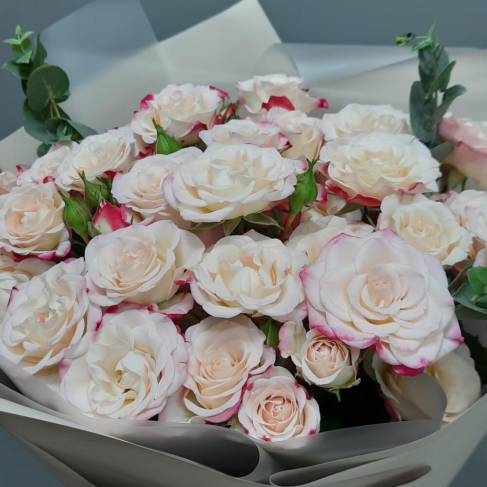 Роза кустовая – 7 шт.Эвкалипт – 2 шт.Упаковка дизайнерская – 2 шт.