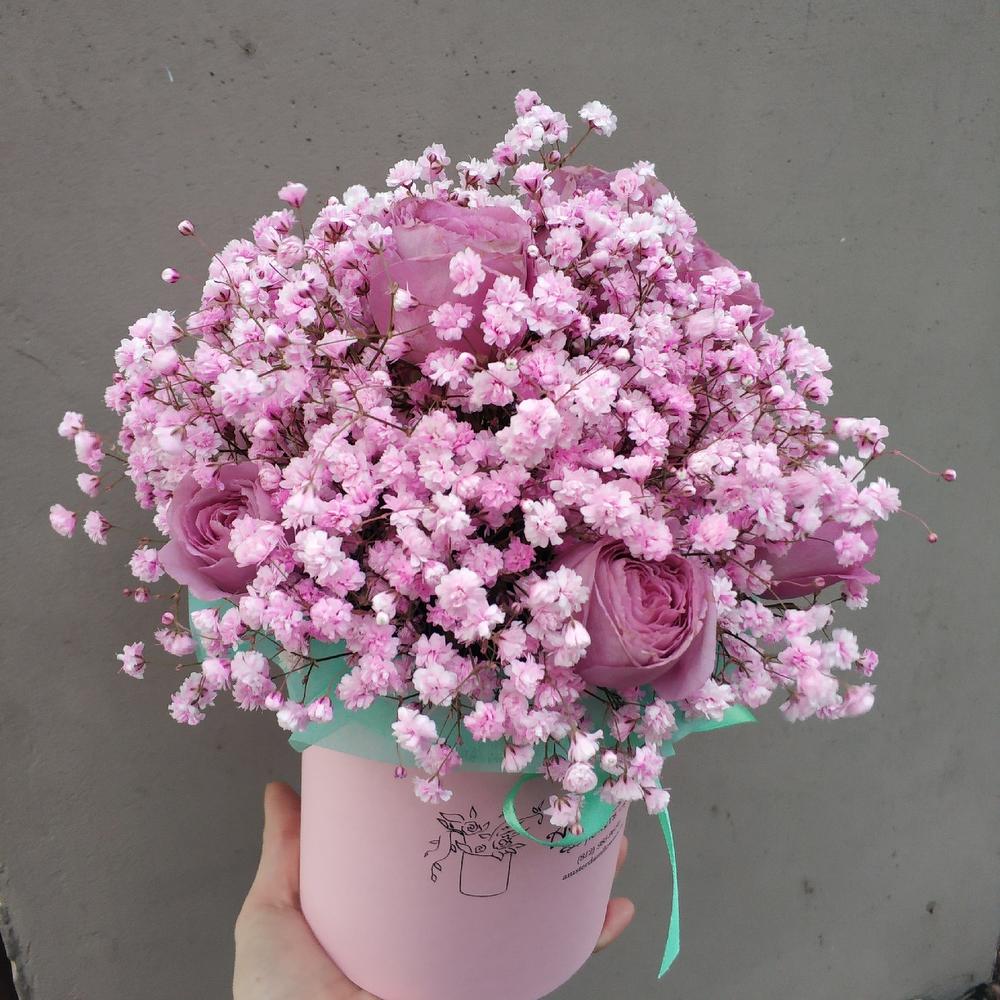Роза кустовая пионовидная – 5 шт.Гипсофила розовая – 3 шт.Коробка d12 – 1 шт.Оазис – 1 шт.Упаковка – 1 шт.Лента – 1 шт.