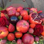 Клубника – 250 гр.Корица – 10 шт.Роза красная – 6 шт.Лента атласная – 2 шт.Гранат – 2 шт.Фисташка – 3 шт.Корзина плетеная – 1 шт.Оазис флористический – 2 шт.яблоко красное – 7 шт.черешня или виноград – 200 гр.нектарин или слива – 6 шт.