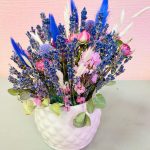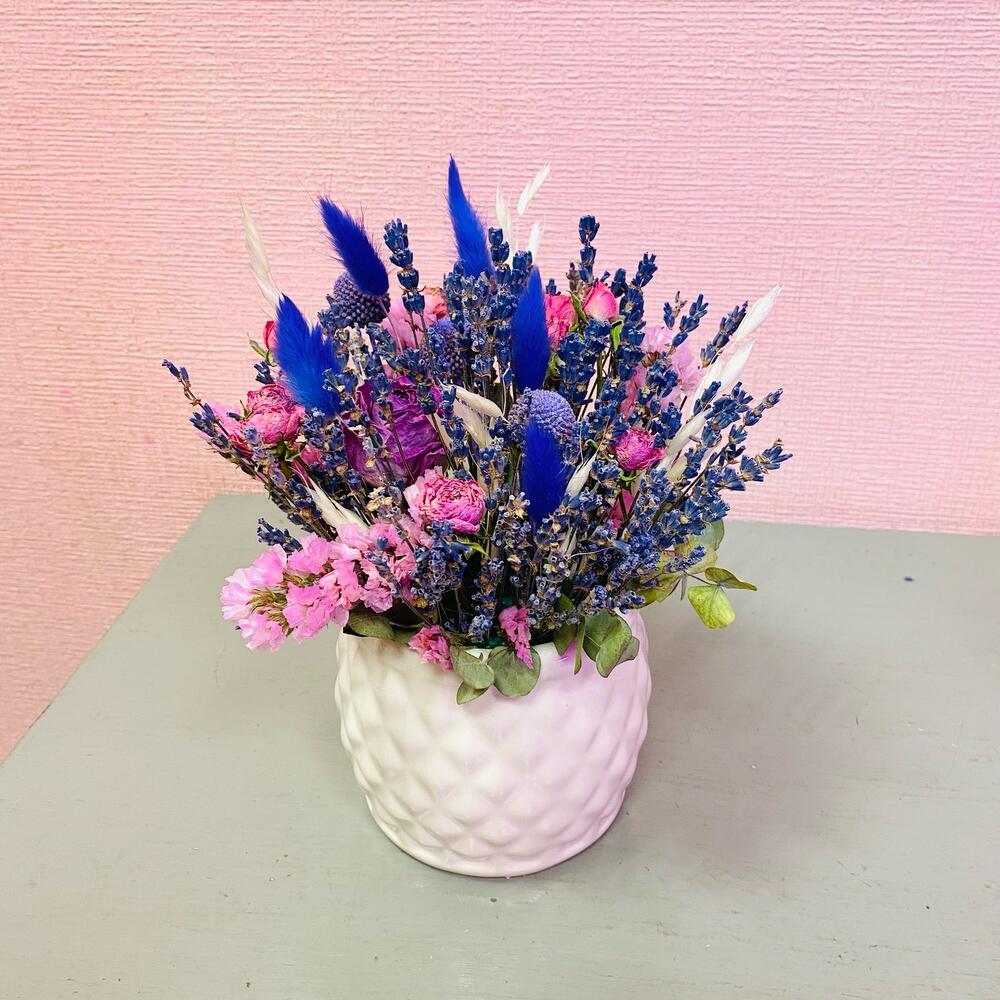 Краспедия – 3 шт.Статица – 1 шт.Лагурус – 5 шт.Лаванда (сухоцвет) пучок – 1 шт.Роза сухоцвет – 2 шт.Кашпо керамическое – 1 шт.Оазис флористический – 1 шт.овес сухоцвет – 2 шт.