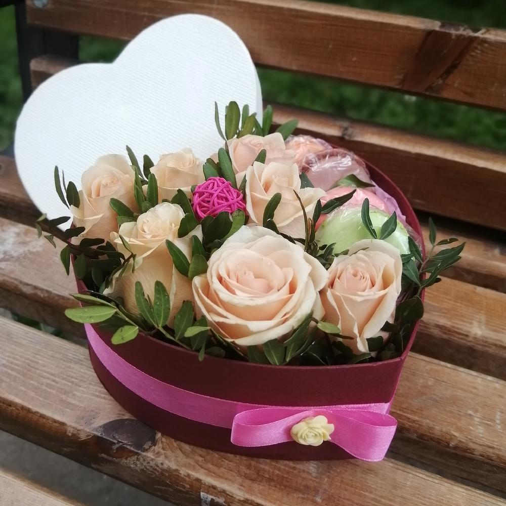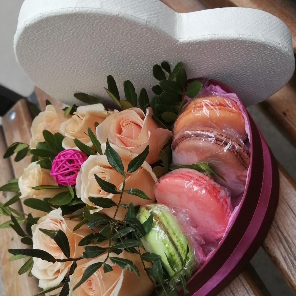 Коробка сердце с цветами и пирожными