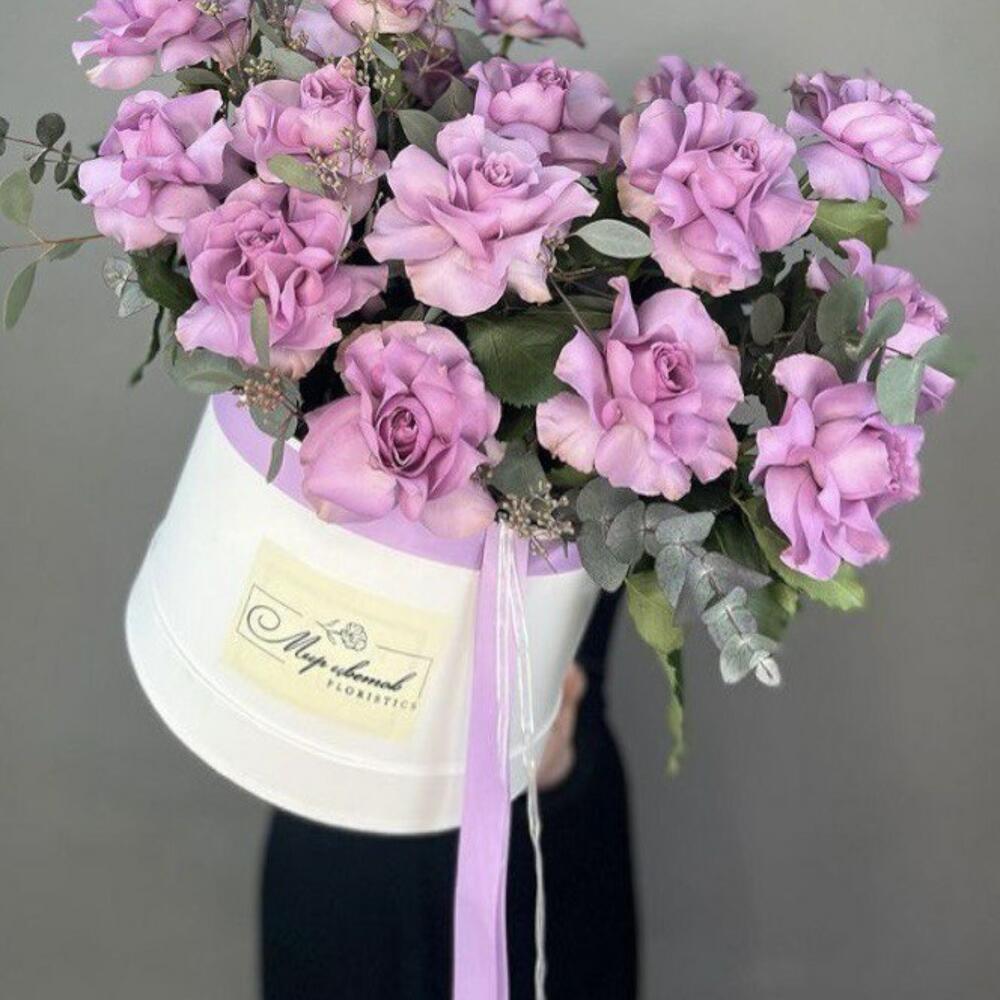 Цветы в коробке с нежными розами, тюльпанами и антириниуми