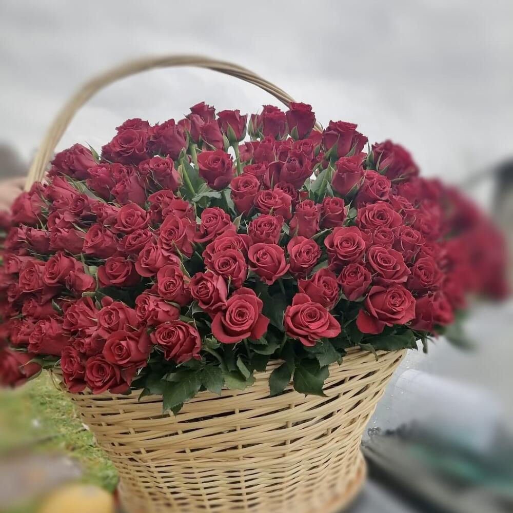 Роза – 501 шт.Корзина плетеная – 1 шт.Оазис флористический – 25 шт.