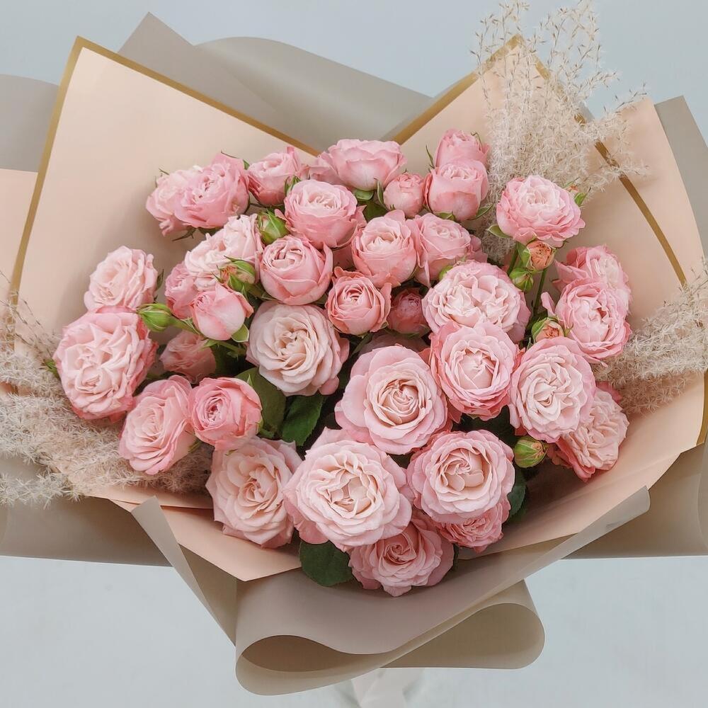 пионовидные кустовые розы – 9 шт. пампасная трава – 3 шт. Упаковка дизайнерская – 1 шт. Открыточка с вашими пожеланиями – 1 шт. инструкция по уходу за цветами – 1 шт.