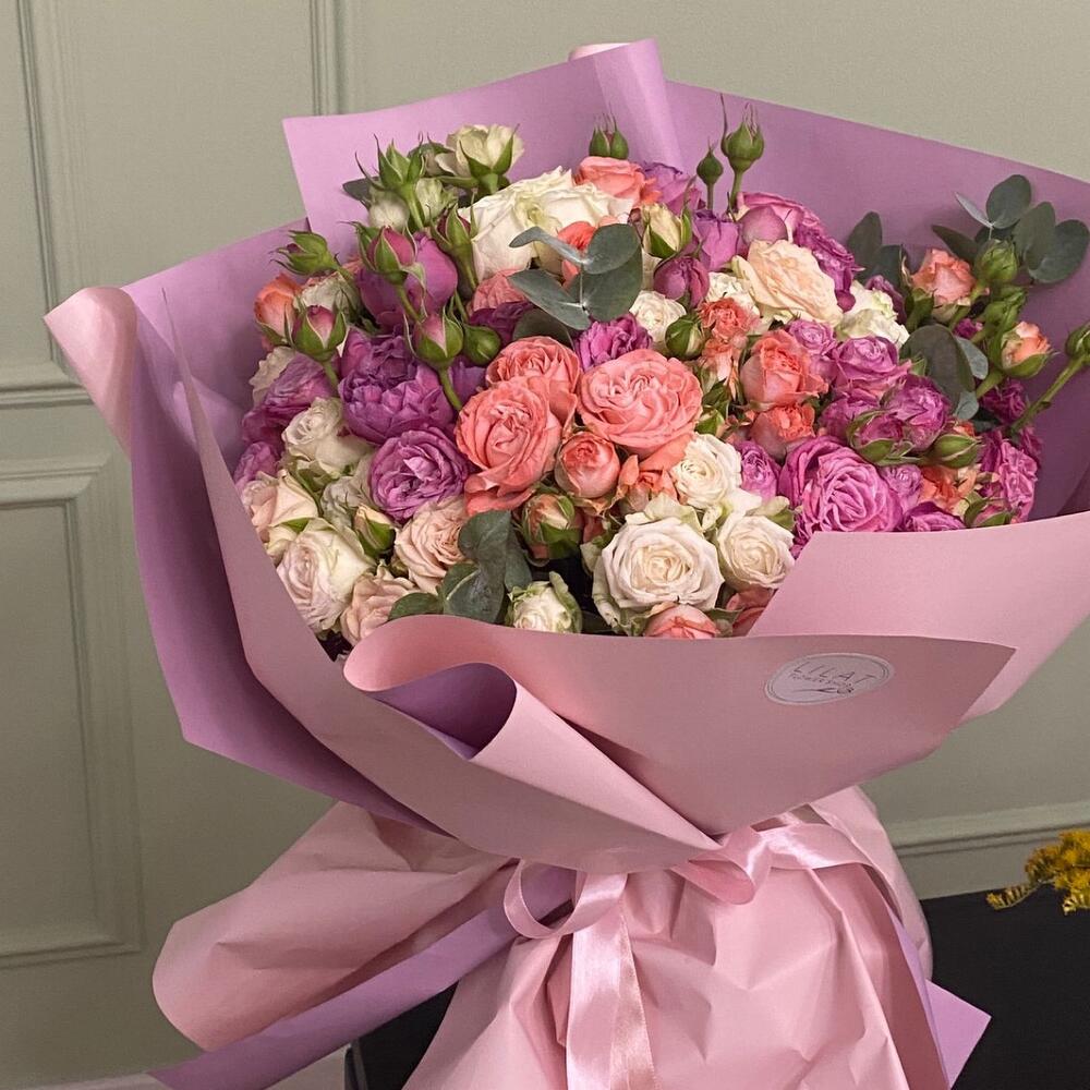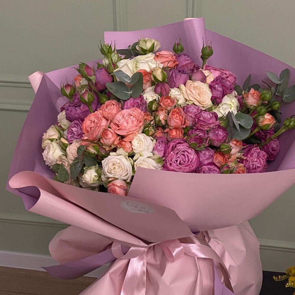 Пионовидная кустовая роза – 31 шт. Упаковка дизайнерская – 5 шт. Открыточка с вашими пожеланиями – 1 шт. доставка – 1 шт.