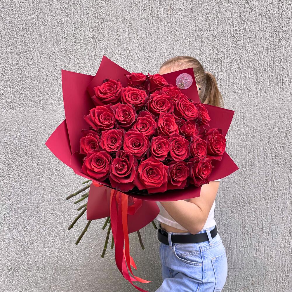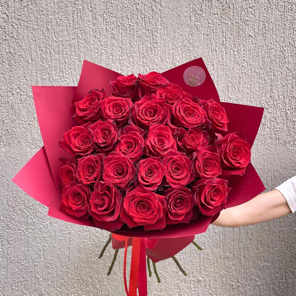 роза (голандия) – 25 шт. Упаковка – 1 шт. Лента атласная – 1 шт.