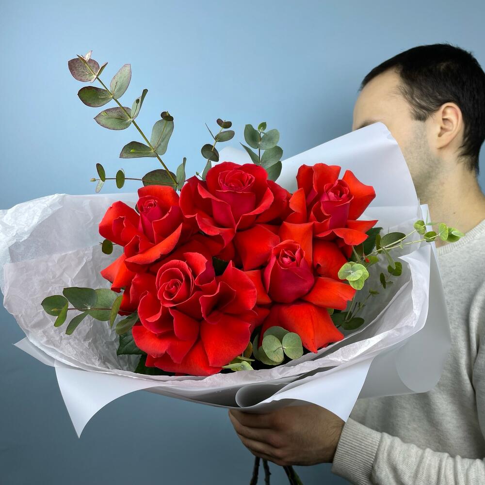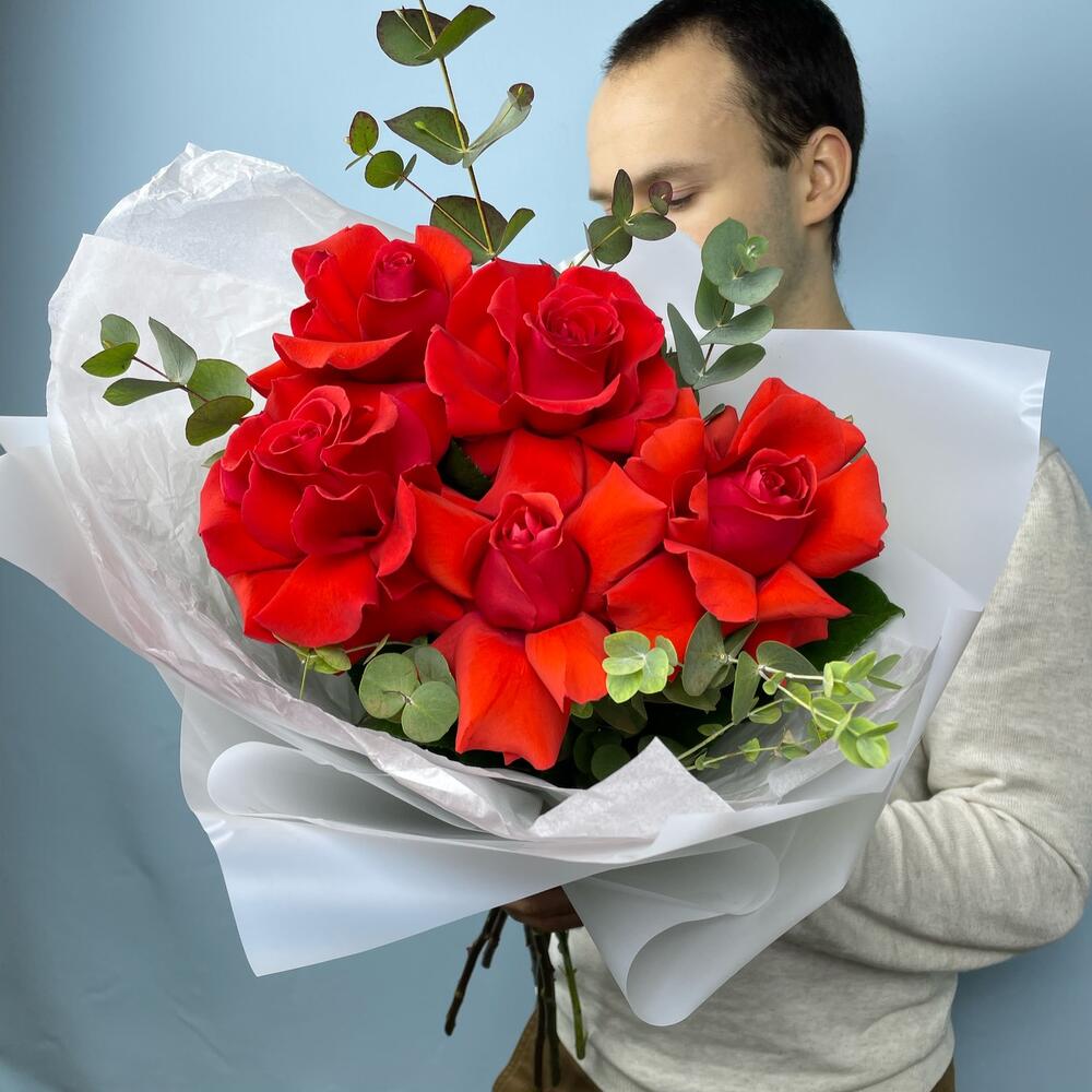 Эвкалипт – 2 шт.Лента атласная – 1 шт.Тишью – 1 шт.Упаковка дизайнерская – 1 шт.Французская роза – 5 шт.