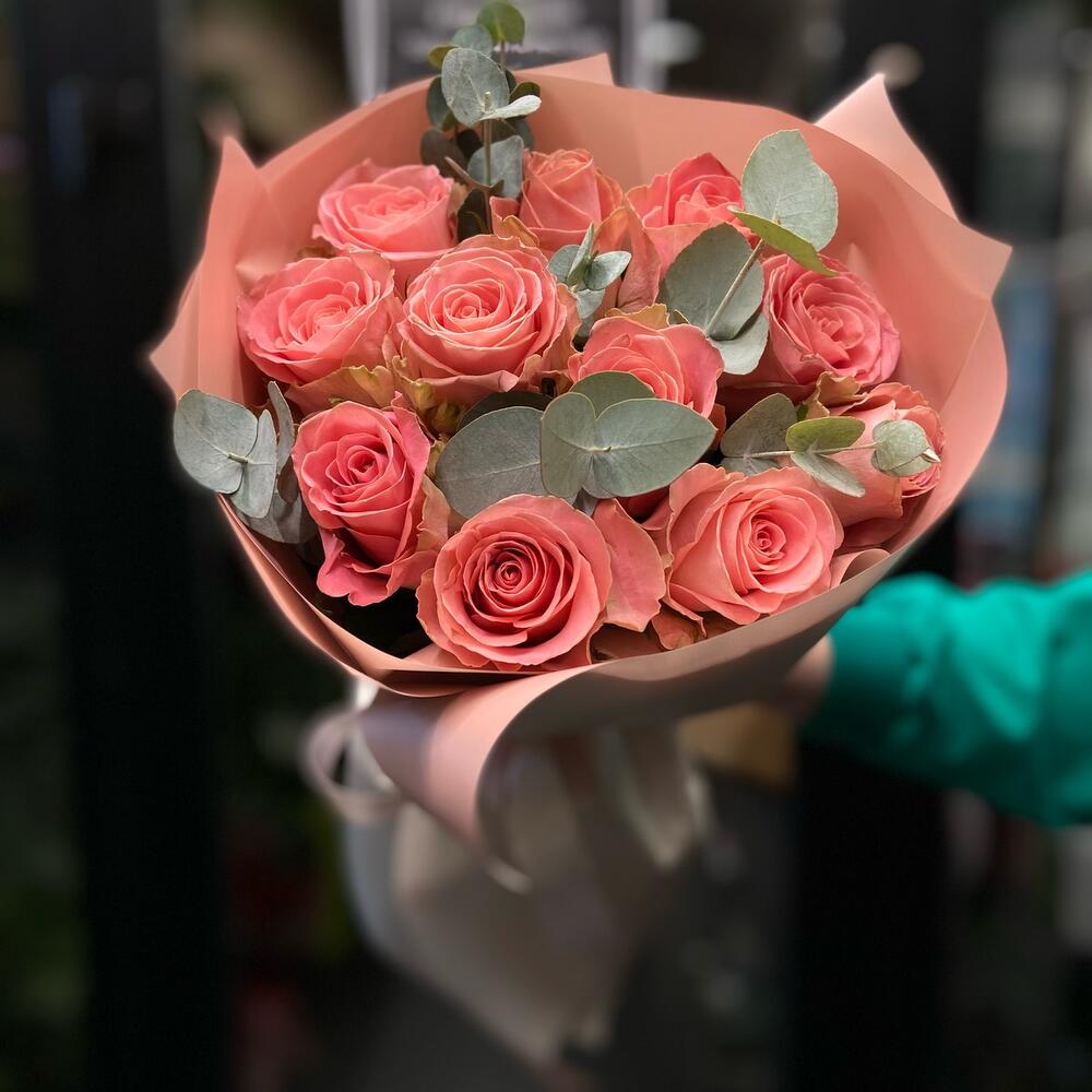 Роза – 11 шт. Эвкалипт – 5 шт. Упаковка дизайнерская – 1 шт.