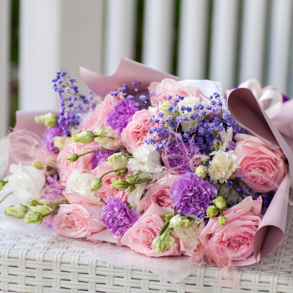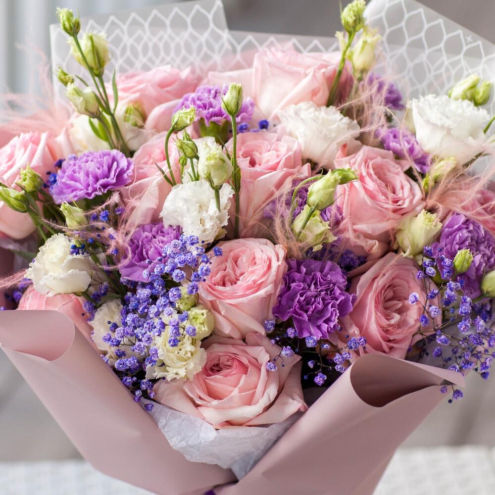 Гвоздики, Кустовые розы, Лизиантусы, Пионовидные розы, Розы