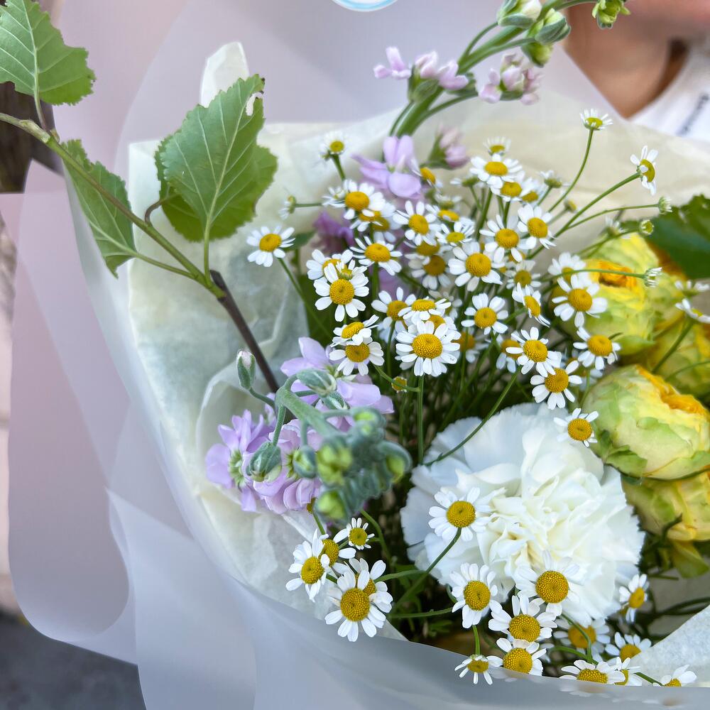Маттиола – 2 шт.Лента атласная – 1 шт.Тишью – 1 шт.Диантус – 2 шт.Ветки березы – 2 шт.Аквапак – 1 шт.Матрикария (Ромашка Камила) – 3 шт.Корейская пленка – 3 шт.Инструкция по уходу – 1 шт.транспортировочная упаковка – 1 шт.кустовая садовая роза – 1 шт.