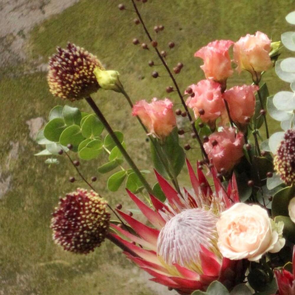 Лента – 1 шт.Лизиантус – 4 шт.Протея – 3 шт.Эвкалипт – 5 шт.Роза пионовидная – 3 шт.Аллиум – 3 шт.Лен – 3 шт.листья магнолии ветка – 3 шт.