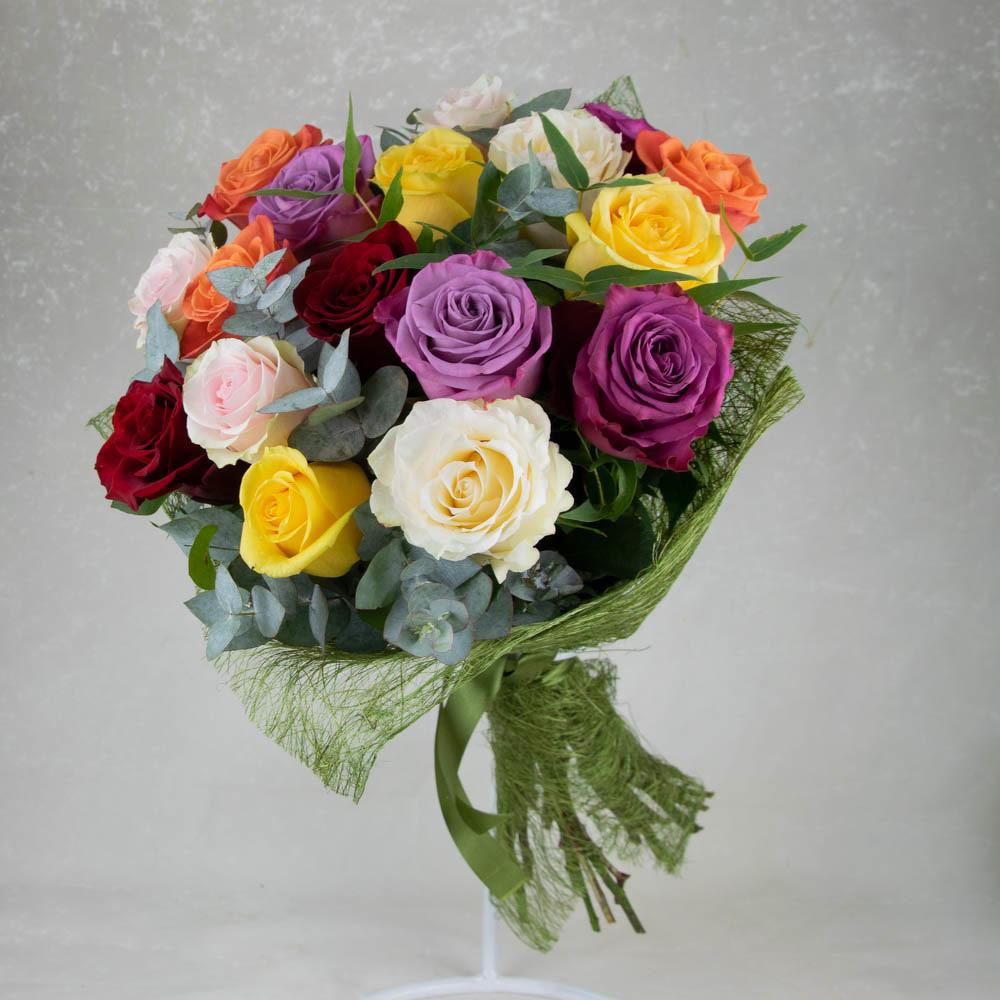 Пышный букет из роз всех цветов. Неожиданно и нетривиально. Размер букета составляет примерно 60. Цветы могут отличаться от тех, что на фото, но цветовая гамма будет сохранена. Букет для тех, кто любит все естественное. Букет обернут натуральным крафтом в таких же тонах. Все вместо симфолизирует близость к природе. К подарку обычно прикладывается наша карточка с красиво напечатанным текстом вашего послания. К букетам обычно прилагается рекомендация по уходу и объяснением причин. При доставке температура в машине курьера контролируется нами в зависимости от сезона.