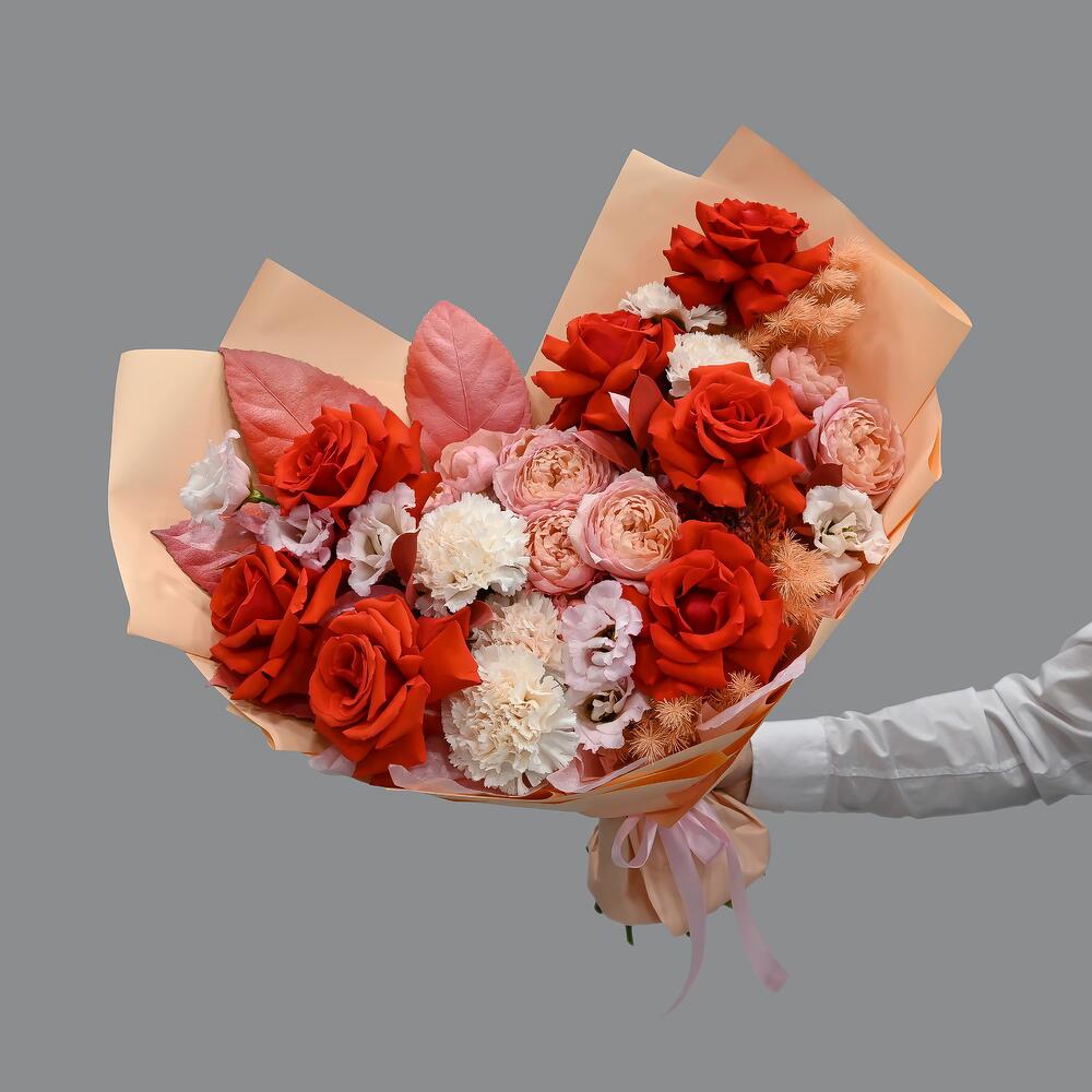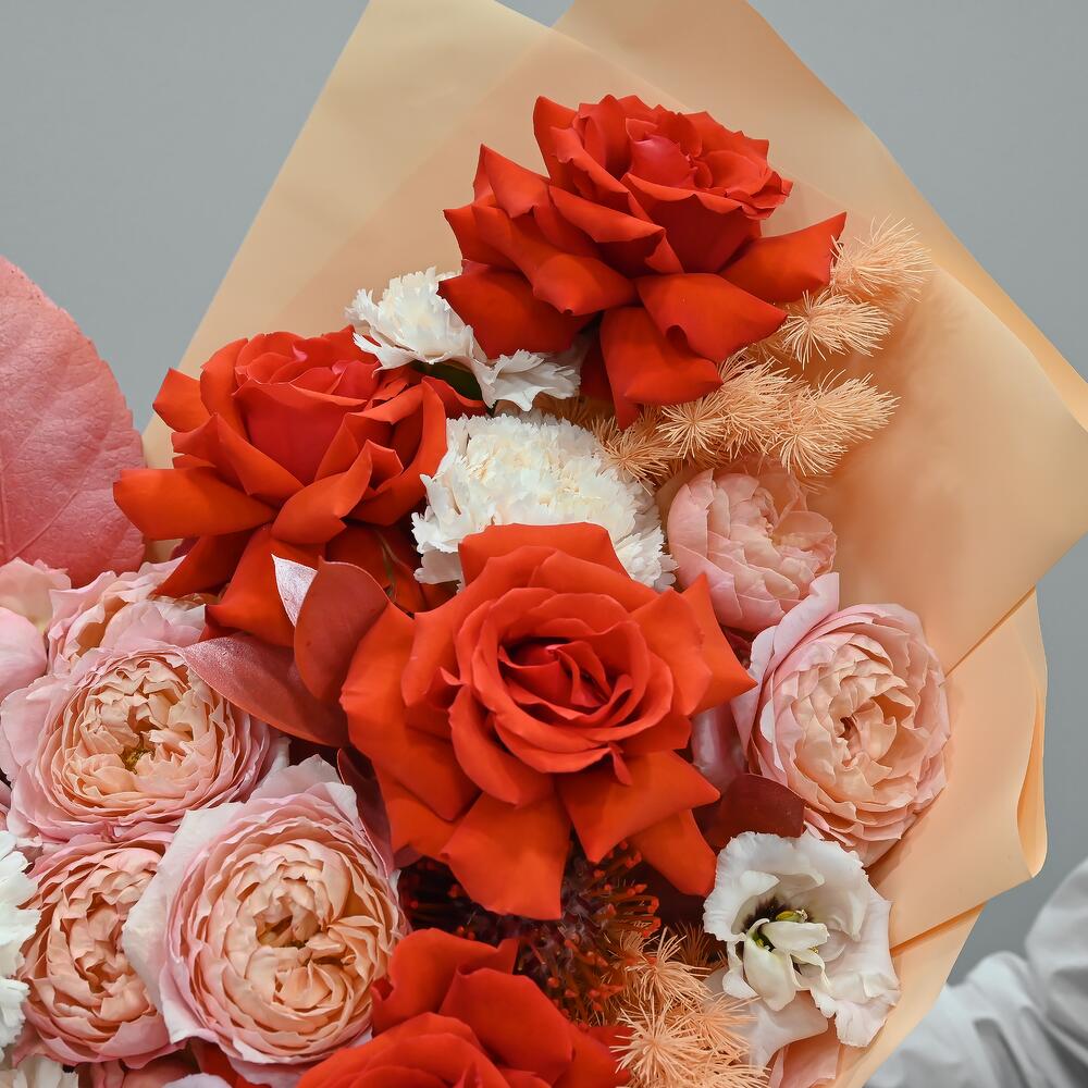 Яркий букет в красно персиковой цветовой гамме. В составе французские розы, пионовидная кустовая роза, гвоздика и лизиантус.Флористы студии Цветочный Этикет собрали его из самых свежих цветов, тщательно продумав состав. Букет готов удивлять красотой своего получателя! … Показать ещёСтанет идеальным подарком для любимой женщины, дочке или мамы, на День Рождения, юбилей, свадьбу и другие торжественные мероприятия. С букетом вы получите конверт с открыткой, в которой мы напишем любое пожелание, инструкцию свежести и средство для продления жизни срезанных цветов.