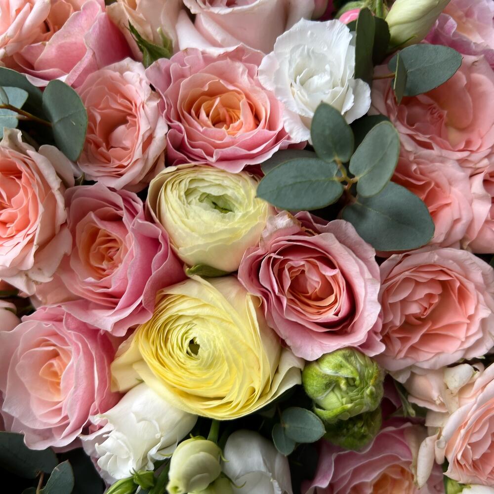 Лизиантус – 3 шт.Эвкалипт – 2 шт.Кустовая роза – 5 шт.Ранункулюс – 5 шт.Пионовидная роза – 4 шт.Атласная лента – 1 шт.Одноголовая роза – 13 шт.декоративная упаковка – 1 шт.