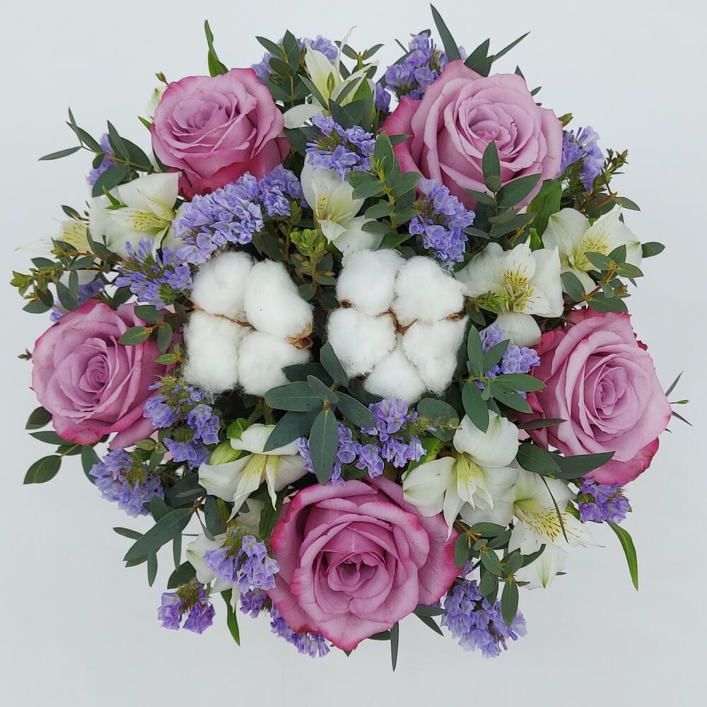 Розы, альстромерия и хлопок в коробке "Сиреневые облака"