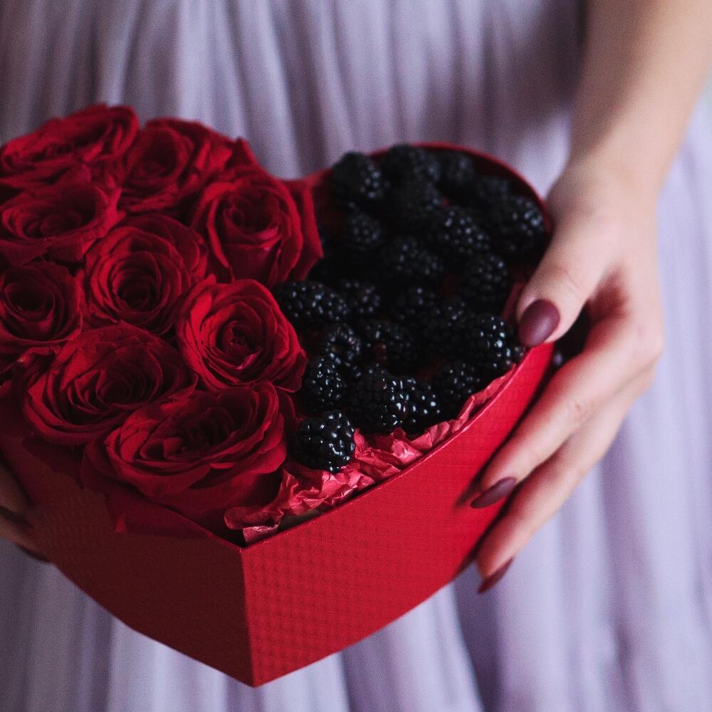 Шляпная коробка – 1 шт.Роза – 9 шт.Ежевика – 300 гр.