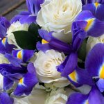 Шляпная коробка с белыми розами и ирисами «Восторг»