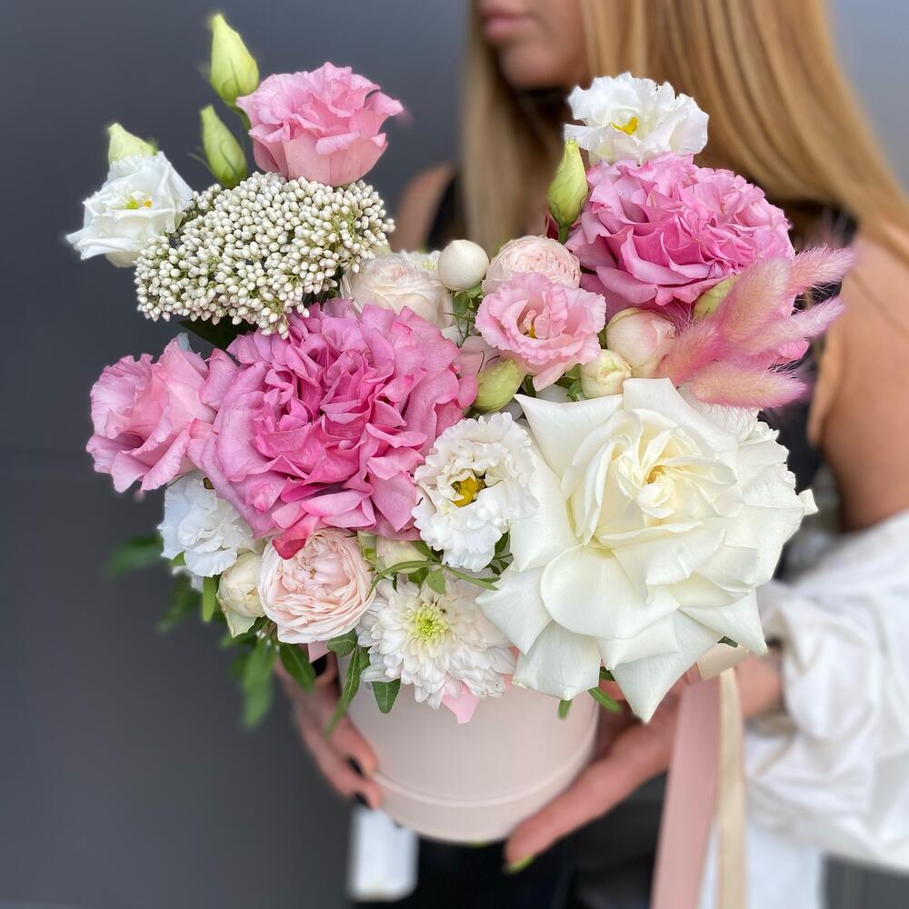 Роза Эквадор – 3 шт.Лизиантус – 1 шт.Озотамнус – 1 шт.Хризантема кустовая – 1 шт.Шляпная коробка – 1 шт.