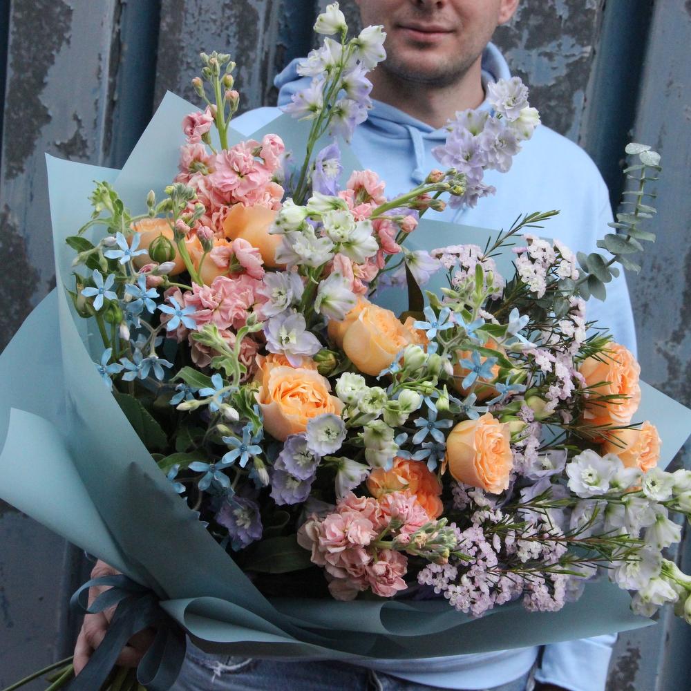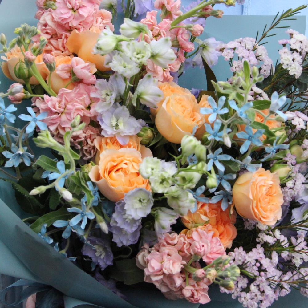 Роза пионовидная кустовая – 3 шт.Твидия – 4 шт.Ваксфлауэр – 3 шт.Маттиола – 4 шт.Эвкалипт – 5 шт.Упаковка дизайнерская – 2 шт.Лента атласная – 2 шт.Астранция – 2 шт.Дельфиниум – 3 шт.